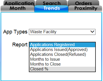 Select Waste Facility for the App Type. Then select Closed % Report.